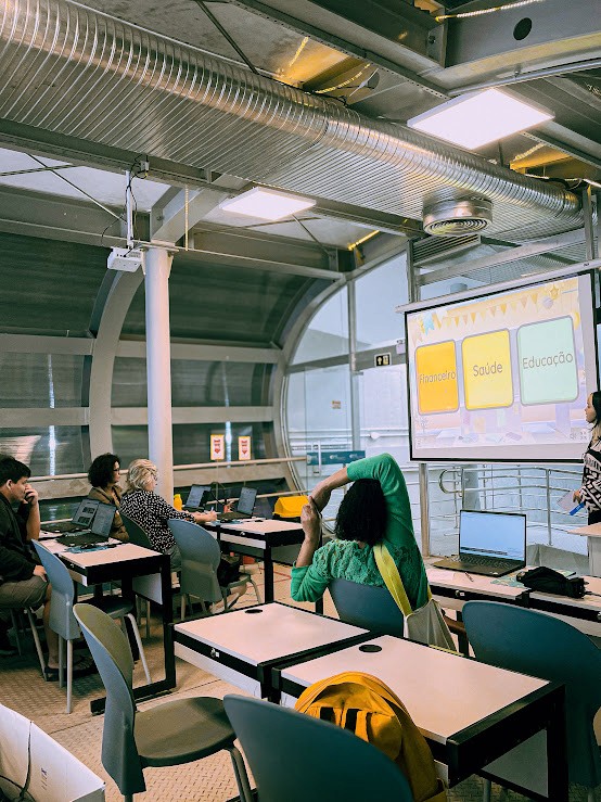 As oficinas acontecem presencialmente, com todo mundo junto aprendendo no mesmo ritmo.